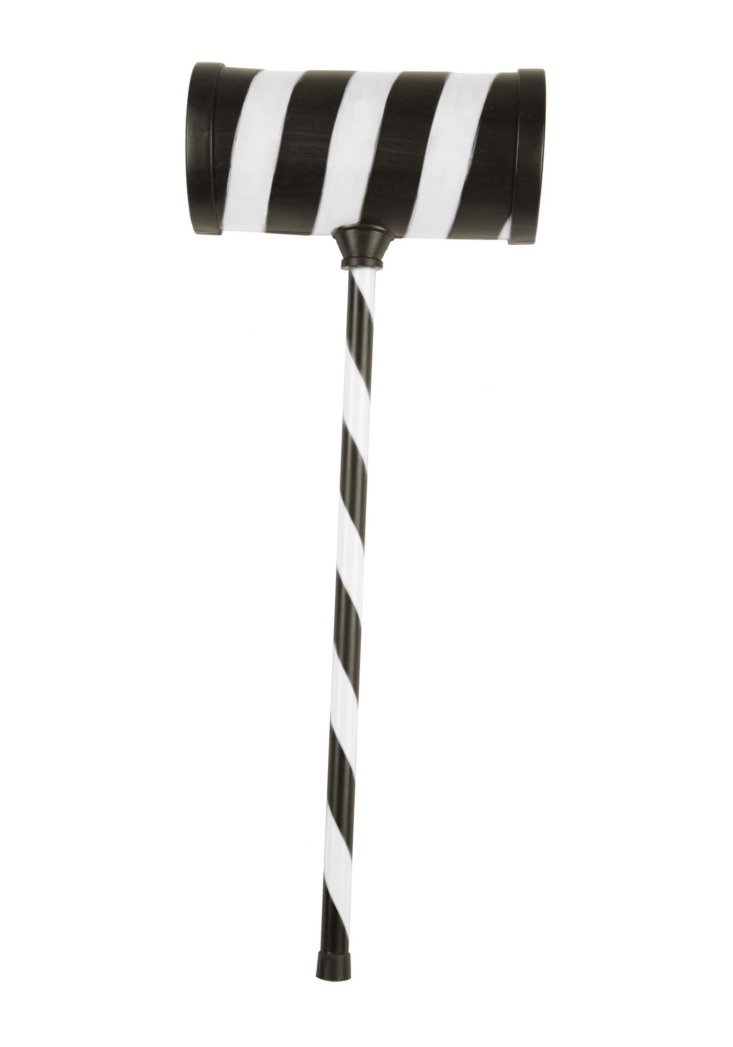 Have a smashing good time this Halloween while you tote this Giant White and Black Hammer! The plastic prop has a long handle striped in black and white, as well as a cylinder-shaped head with flat, circular ends.Â
