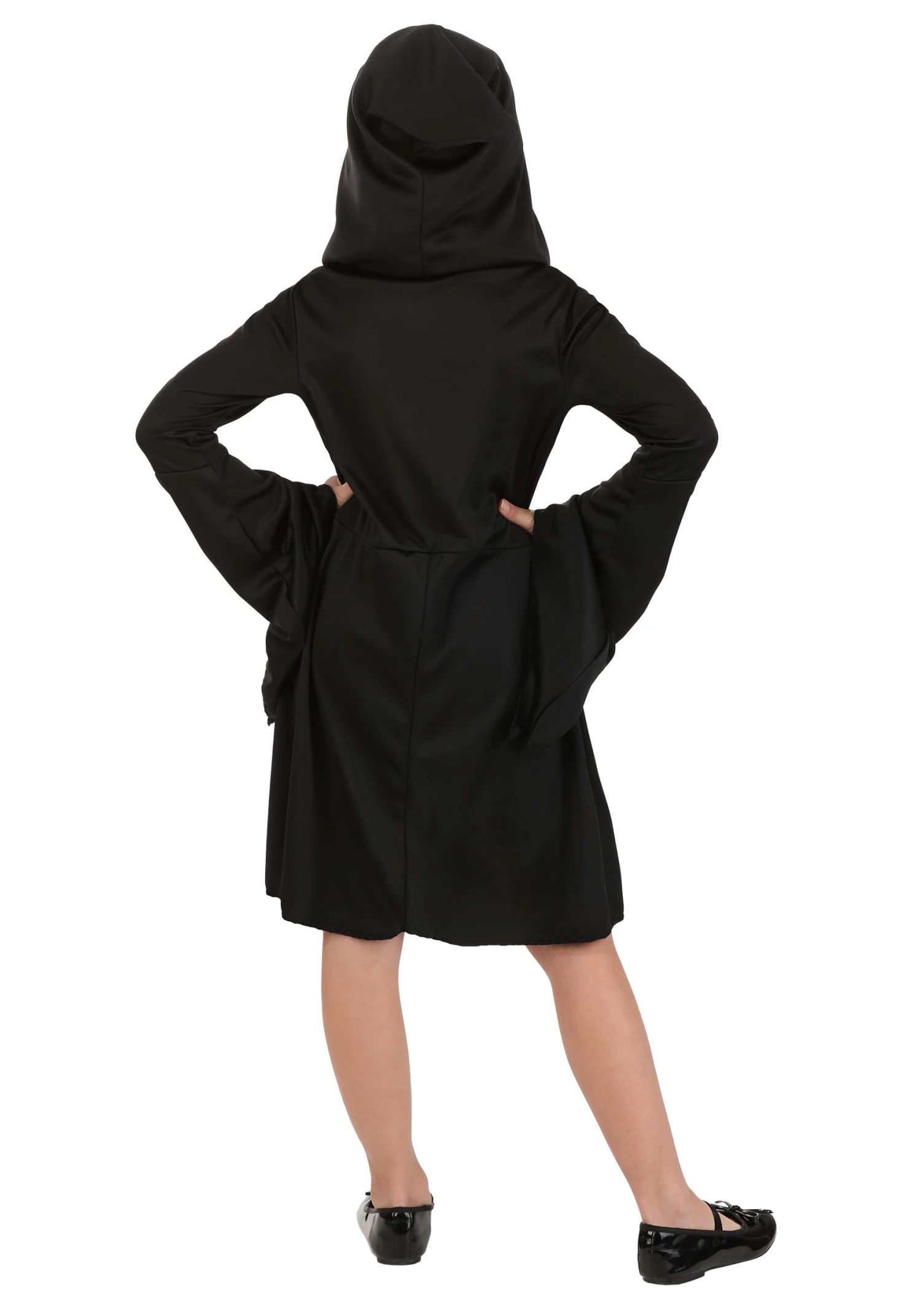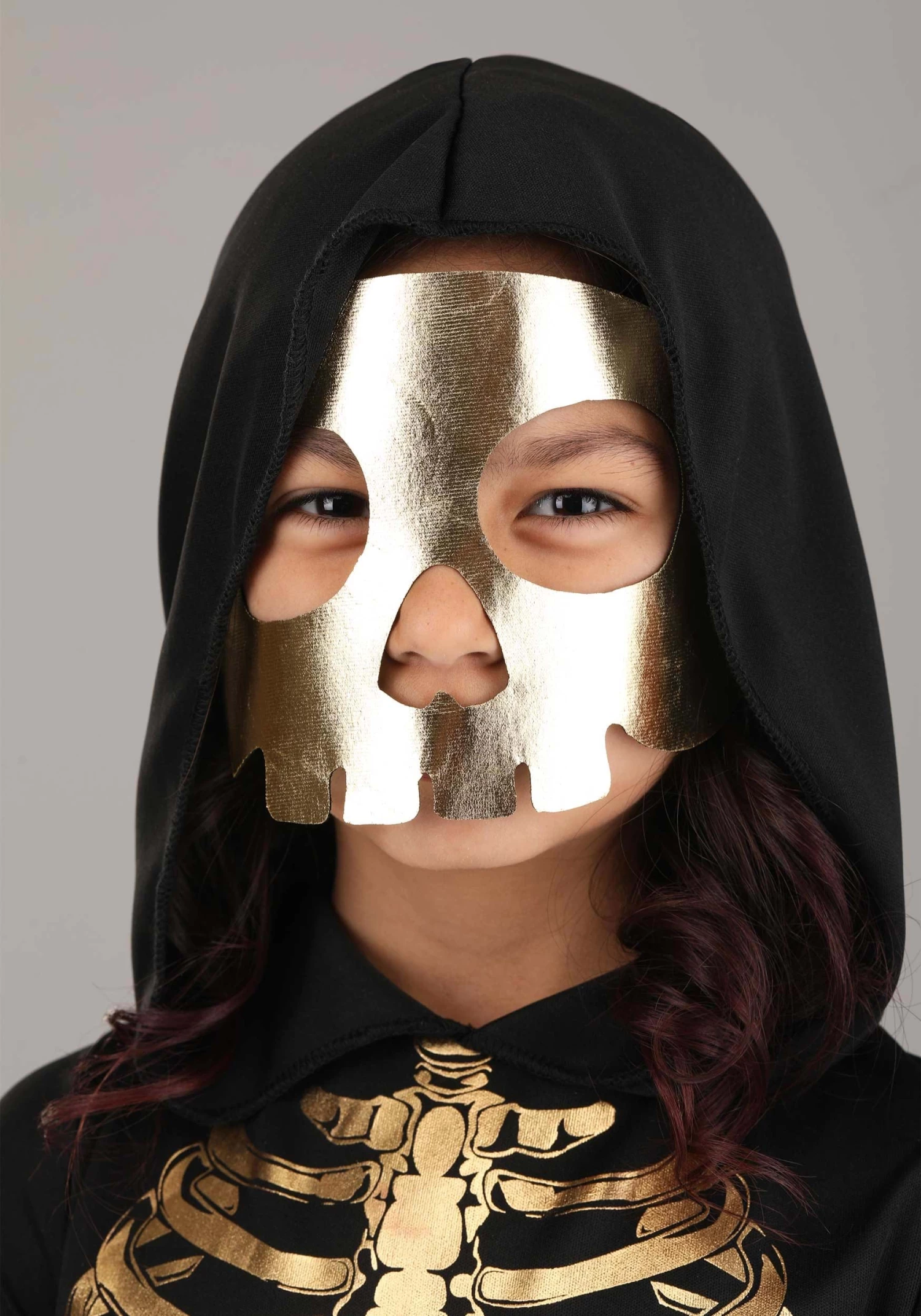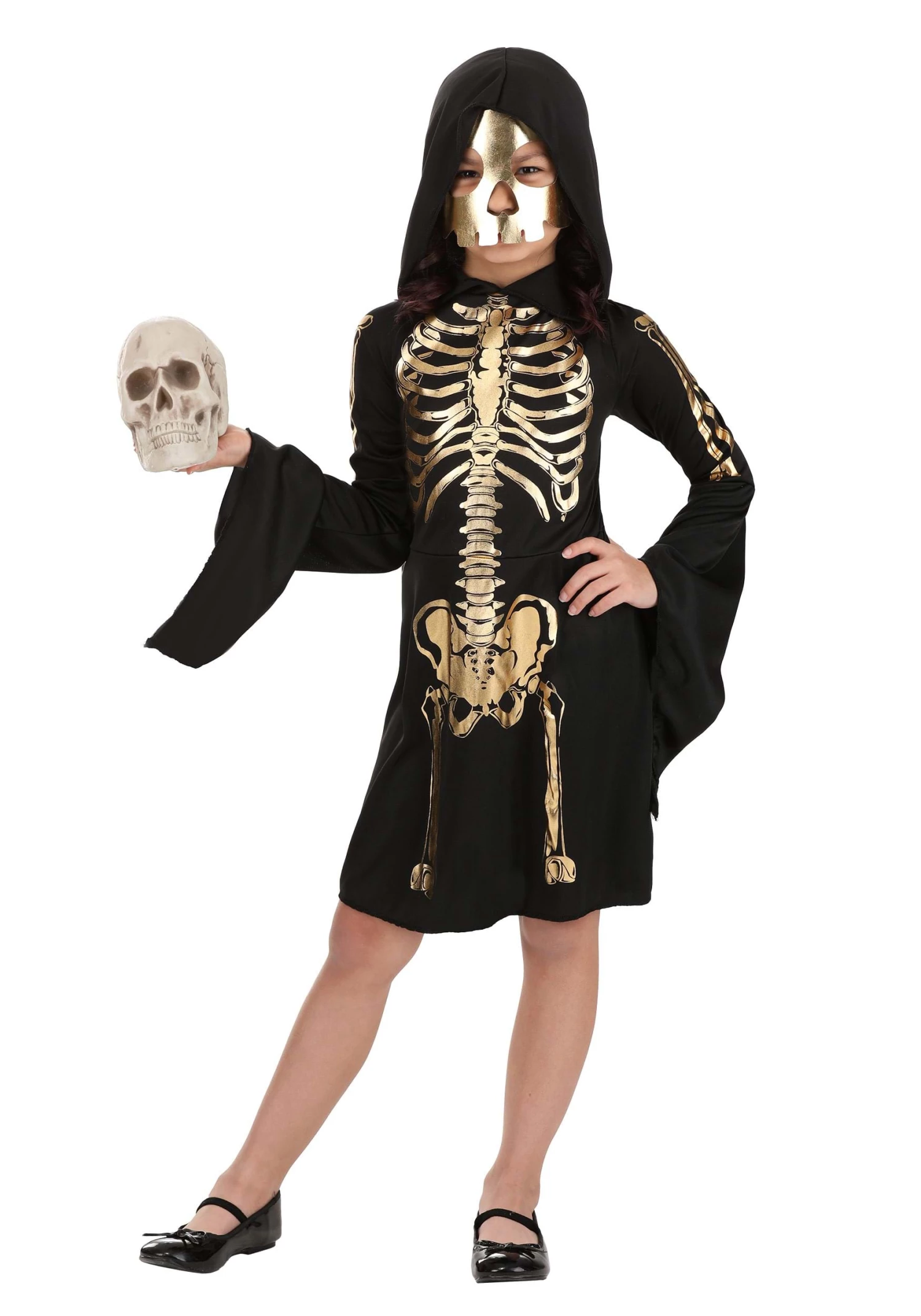 Become a gorgeous ghoul in this exclusive Girl’s Gilded Skeleton Costume Dress! The swingy black pullover dress is made of soft black jersey knit fabric. Elastic is sewn into the back of the waistband to ensure a flattering and comfortable fit. The front of the dress and its flared sleeves are printed with metallic gold skeleton details, including arm bones, spinal bones, a ribcage, pelvic bones, and more. The attached hood comes to a point at the end. Pull it up when you wear the metallic gold faux leather skull mask to conceal your human features.Â