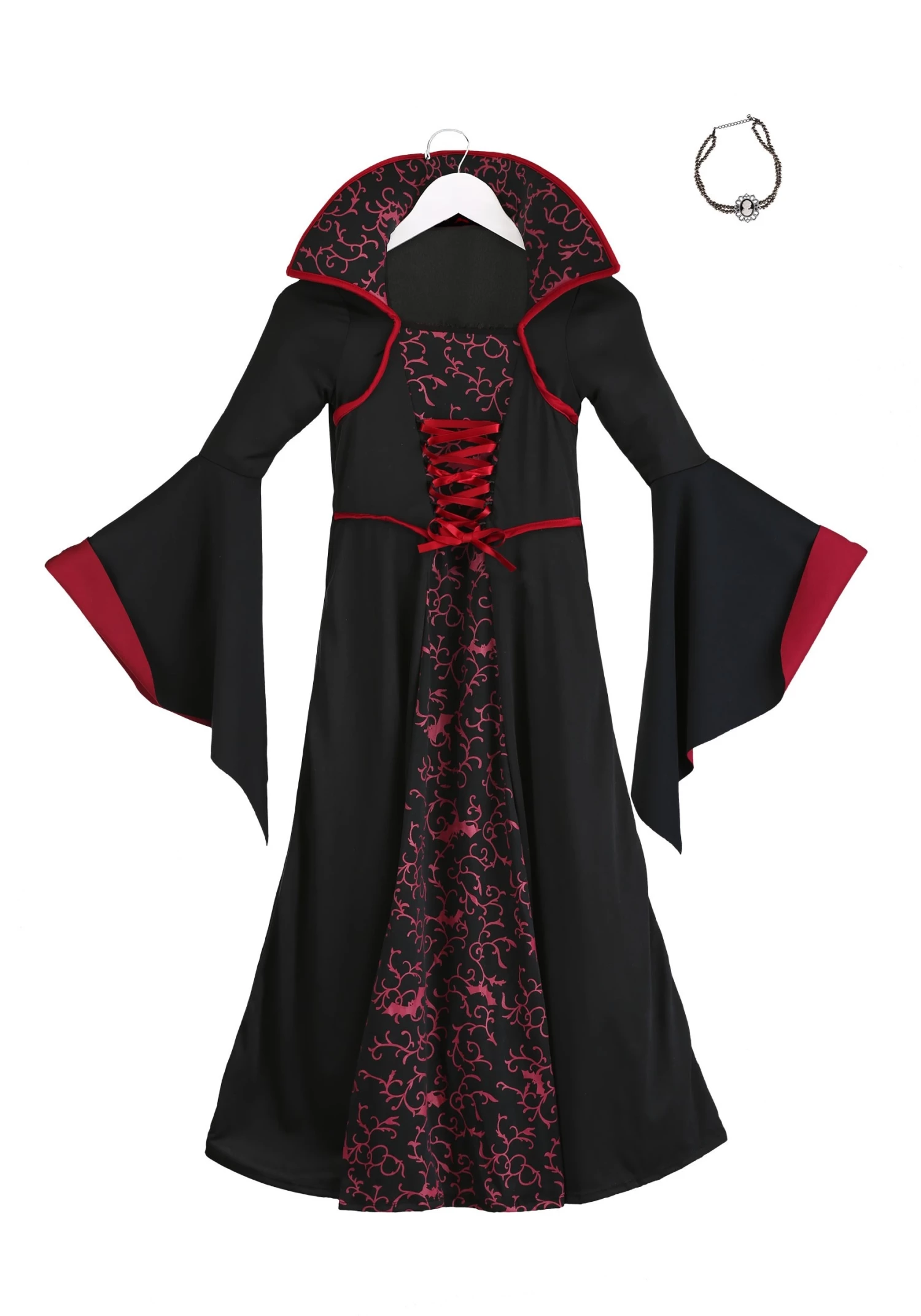 With burgundy and black color themes, this dress is likely to be packed into her travel bag, even if she has to leave all her other clothes behind just to make room! And that’s good, because this look will have her fitting in with the rest of the vampires in the neighborhoods you visit, so if you need to stop and ask directions she’ll look like a local. She might have so much fun pretending to be a vampire, that you might find yourself heading back to Transylvania sooner than you expected!