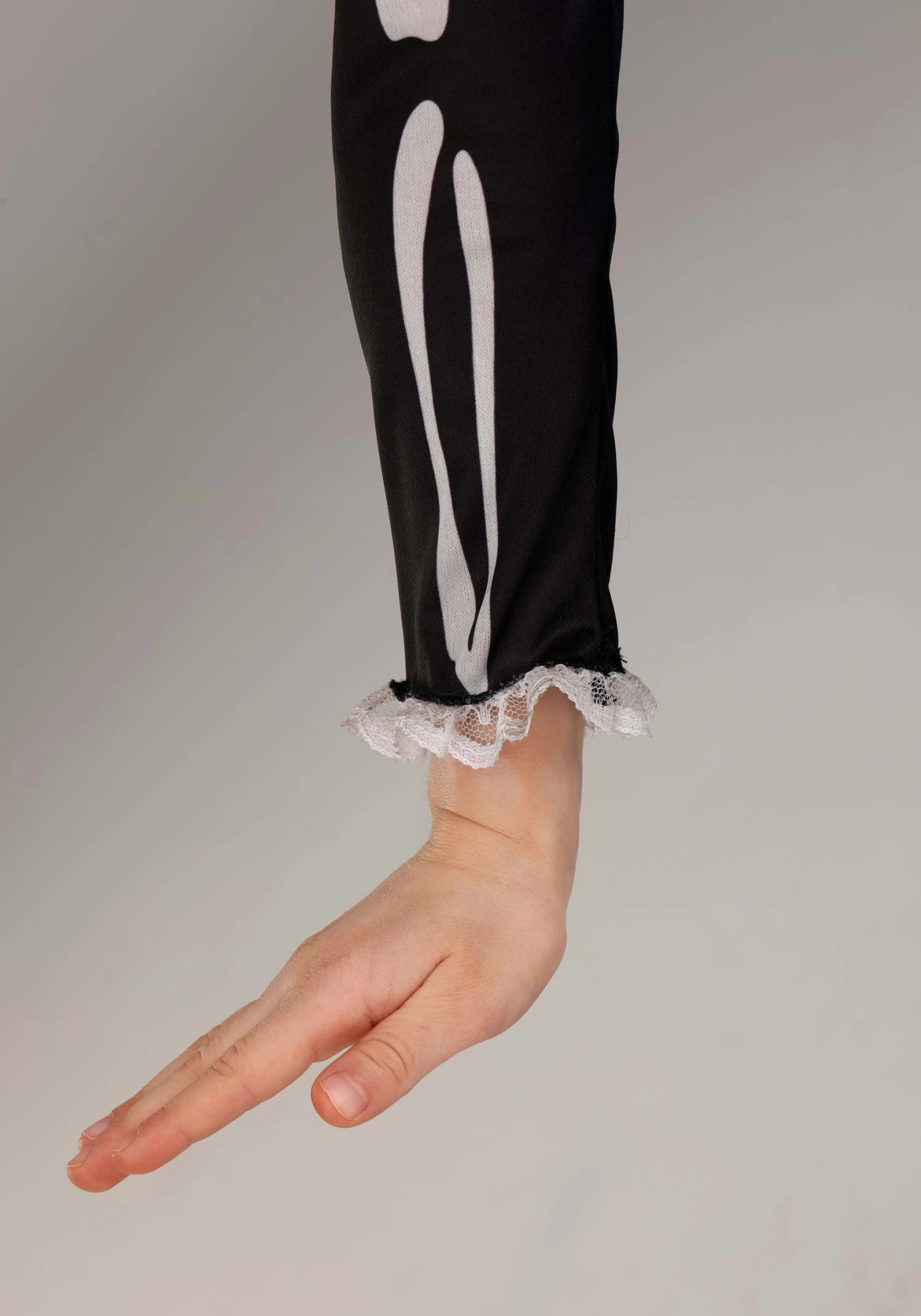 - Jersey knit bodice has printed bones, lace edging at neck & sleeve cuffs