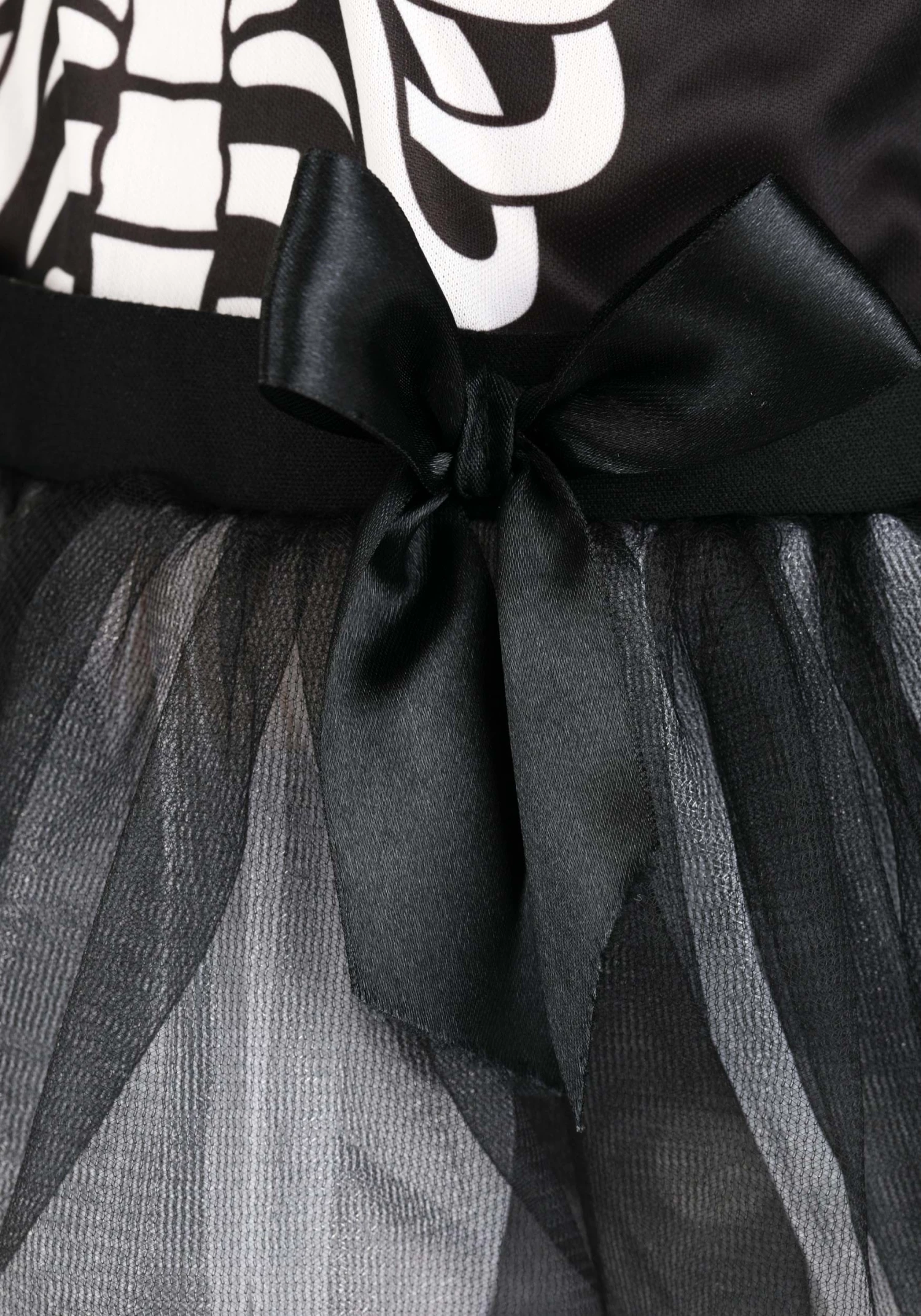 - Skirt is layered mesh below sewn-in ribbon waist sash