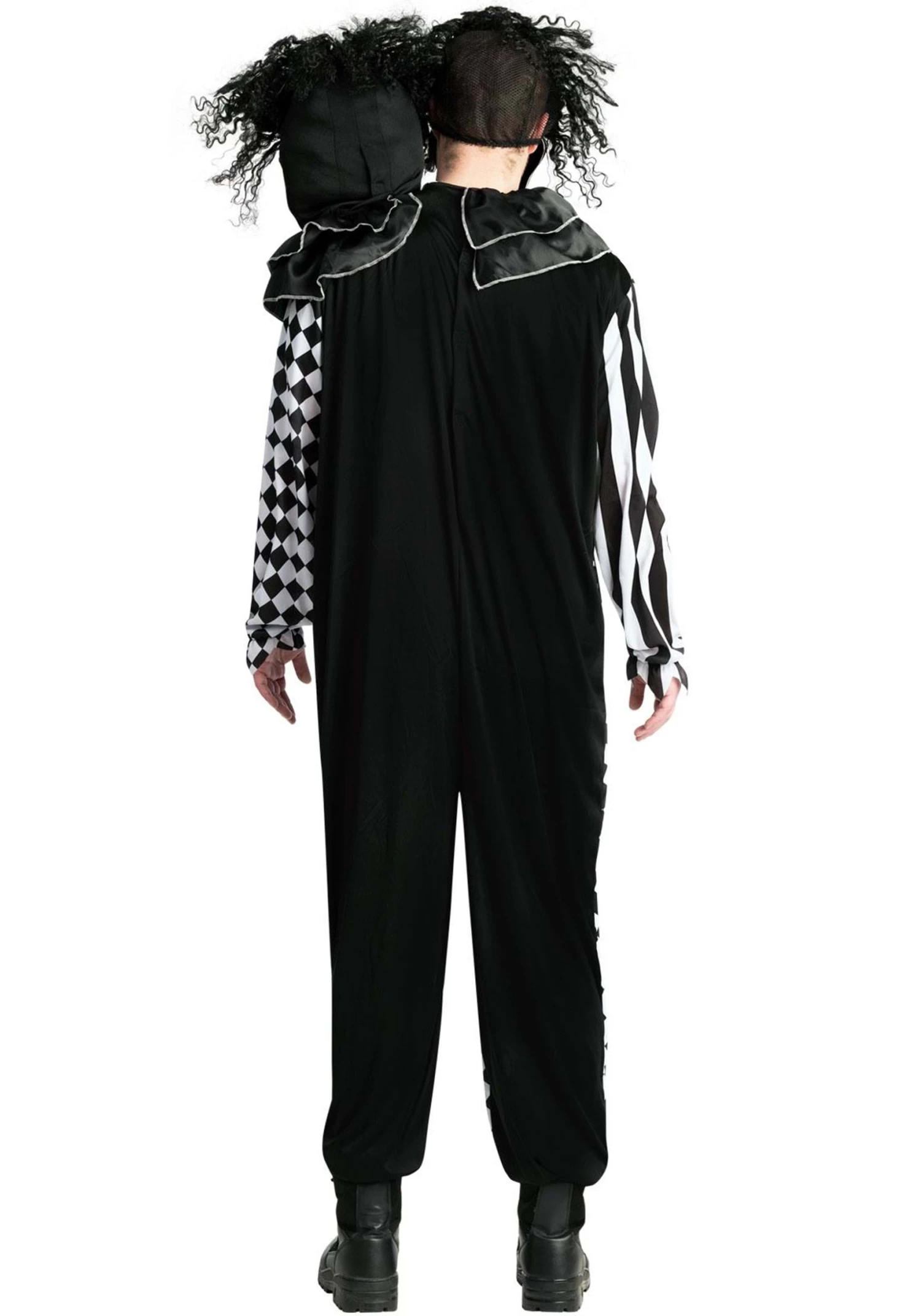 You’ll be double the fun and double the fear factor thanks to your Two-Headed Clown Costume for Adults! The jumpsuit fastens up the back and has elastic in each wrist. One side of the outfit has printed black and white diamonds from shoulders to ankles, while the other side has printed black and white stripes. The patterns alternate on each sleeve. Two ruffled collars are sewn to the neck area: One is for your head to poke through, and the other is for the stuffable clown head that will join you everywhere you go.Â