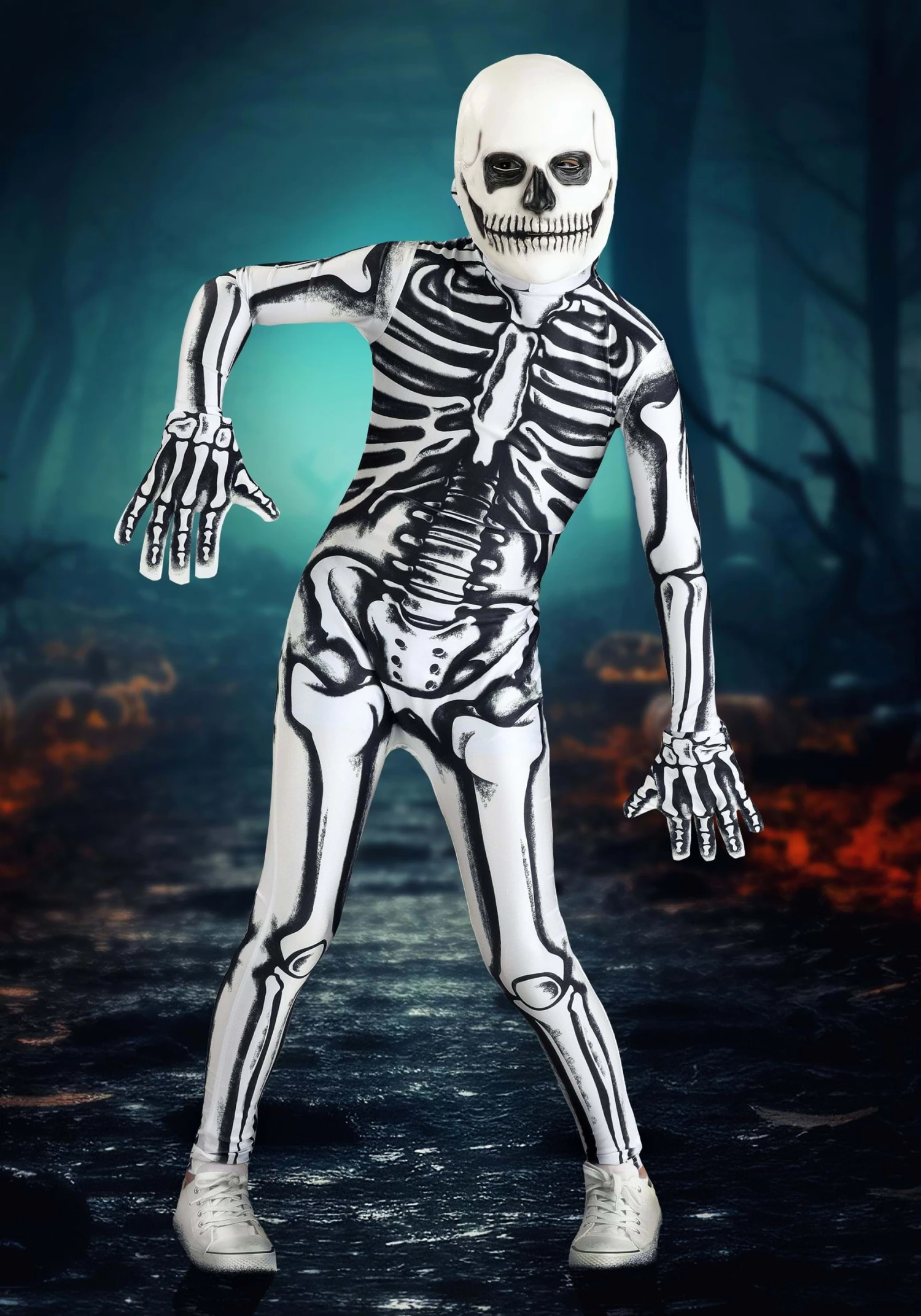 Give your kiddo some Halloween fun while keeping an eye on those bones with this White Skeleton costume from our Made by Us costume line. This is an exclusive jumpsuit that is printed to show off a proud skeletal structure, all in a bright white for Halloween safety. It includes a foam mask for the skull and a pair of gloves for the hands. (Vitamin D still recommended for internal bones.)