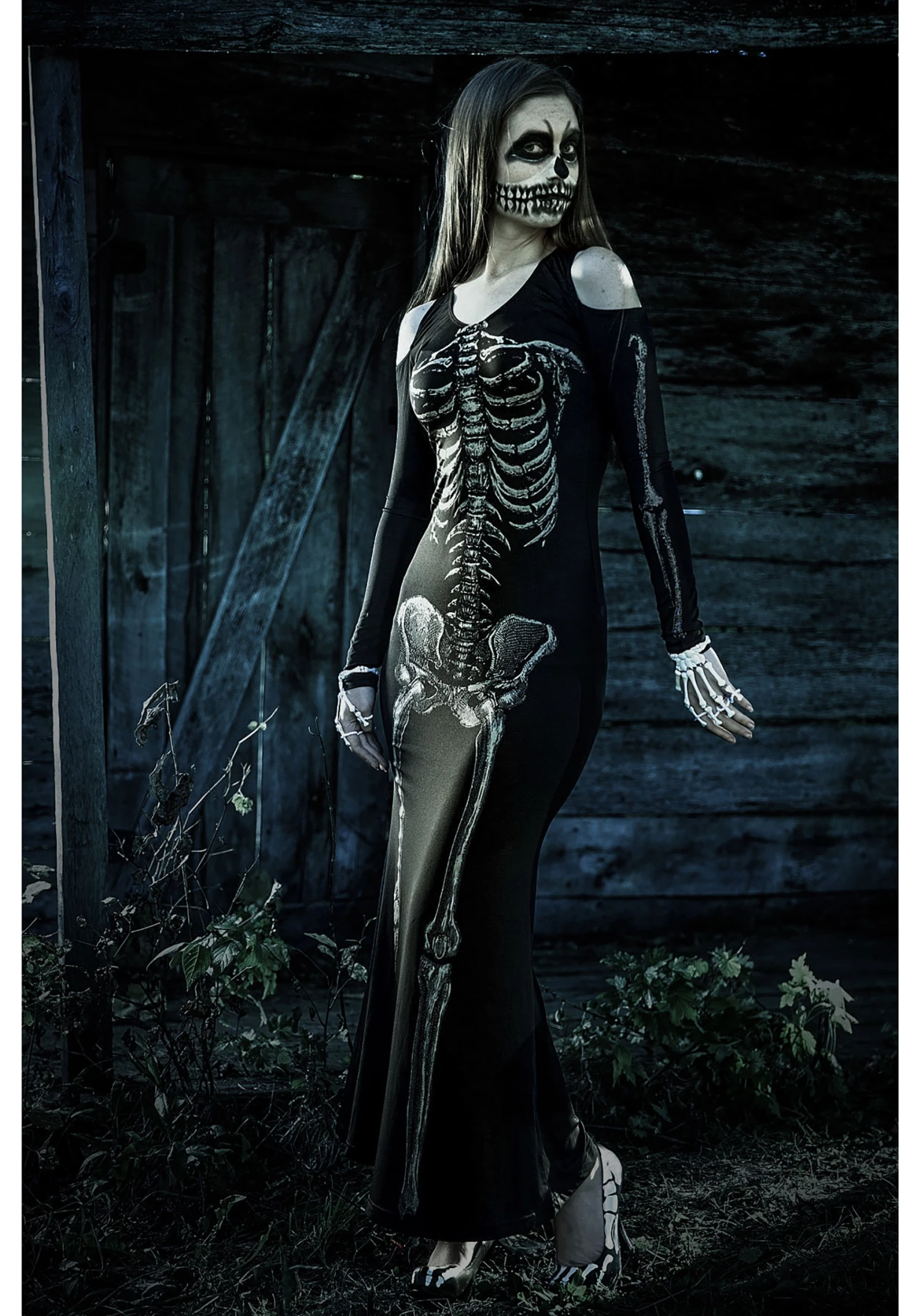 Well, are you going to a spooky fancy dress party sometime soon? You’ll need the perfect dress to impress! With this Bone Appetite skeleton dress you’ll be set for a night of ghoulish fun. Even the head less horseman might turn his head at your elegant take on the classic skeleton, and for him that takes extra effort! This costume will help you get started on your look from the crypt in no time. The costume includes a long sleeve pullover maxi dress that has shoulder cutouts for added detail. The real showstopper, though, is the all-over printed skeleton graphics that glow in the dark. You are sure to make a grand entrance to your party in this dress! Add some skeleton makeup and a pair of black gloves for a complete look that is straight from the grave!